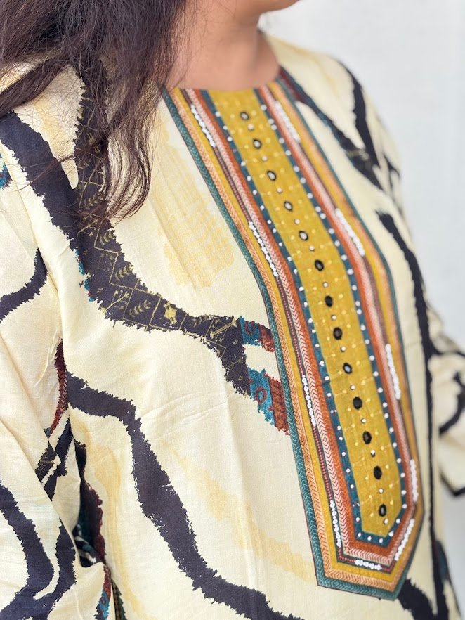 * Embellished Yoke: Rich mustard-yellow neckline featuring intricate embroidery and subtle sequin work.