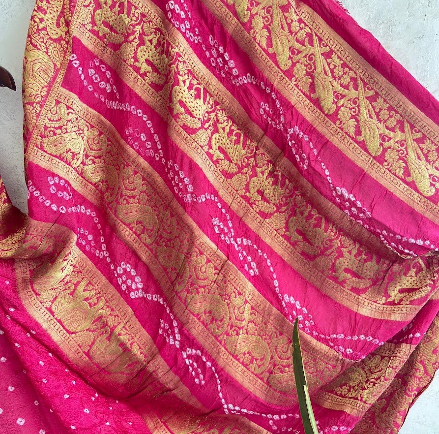 Exude classic charm with this vibrant crimson red saree, a masterpiece of traditional craftsmanship. Featuring iconic hand-knotted Bandhani dots and a majestic golden zari border with elephant and floral motifs, this saree is the epitome of ethnic luxury.