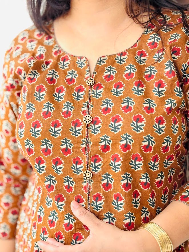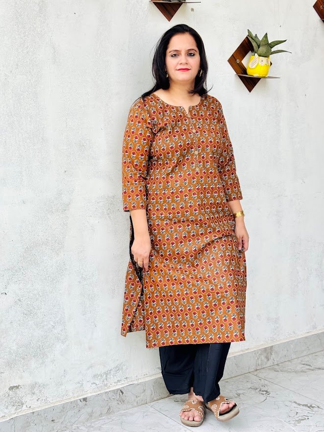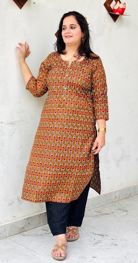 This straight-fit kurta combines traditional craftsmanship with a modern silhouette. The earthy mustard base provides a warm, sophisticated backdrop for the intricate floral hand-block motifs.