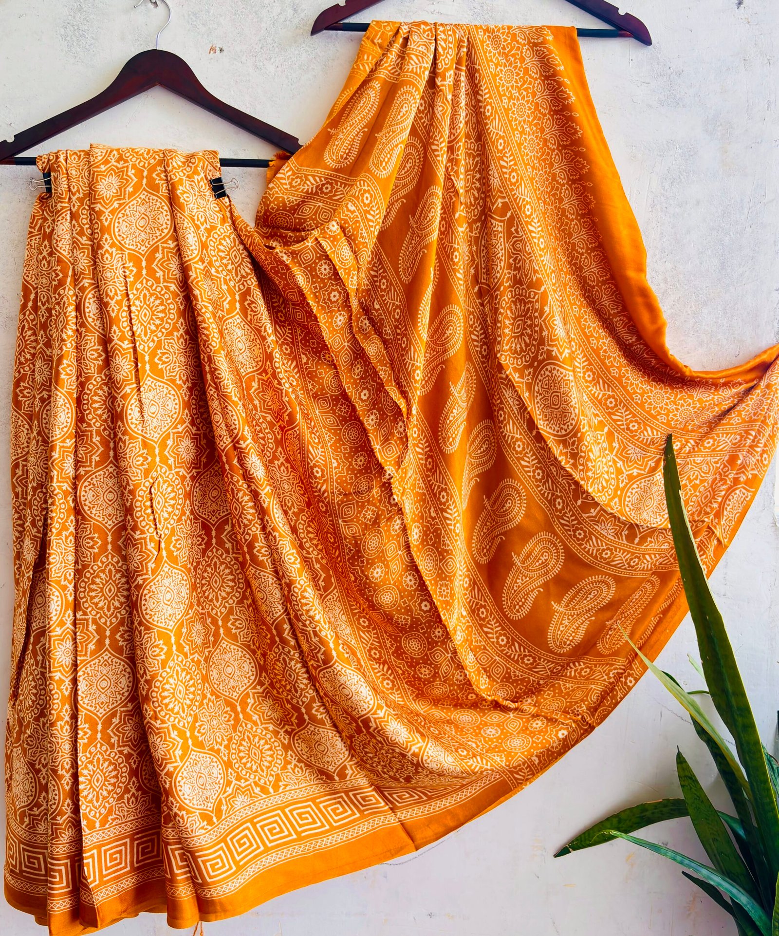 Mustard Radiance: Traditional Paisley & Geometric Print Saree