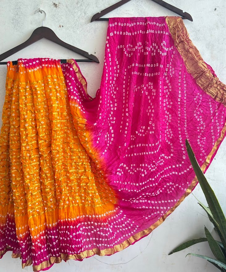 Brighten your celebrations with this stunning orange and magenta pink saree. Featuring traditional hand-tied Bandhani patterns on a textured fabric, this piece transitions beautifully between two high-energy colors, finished with a sleek golden tissue border.