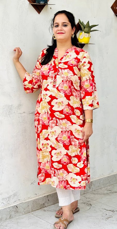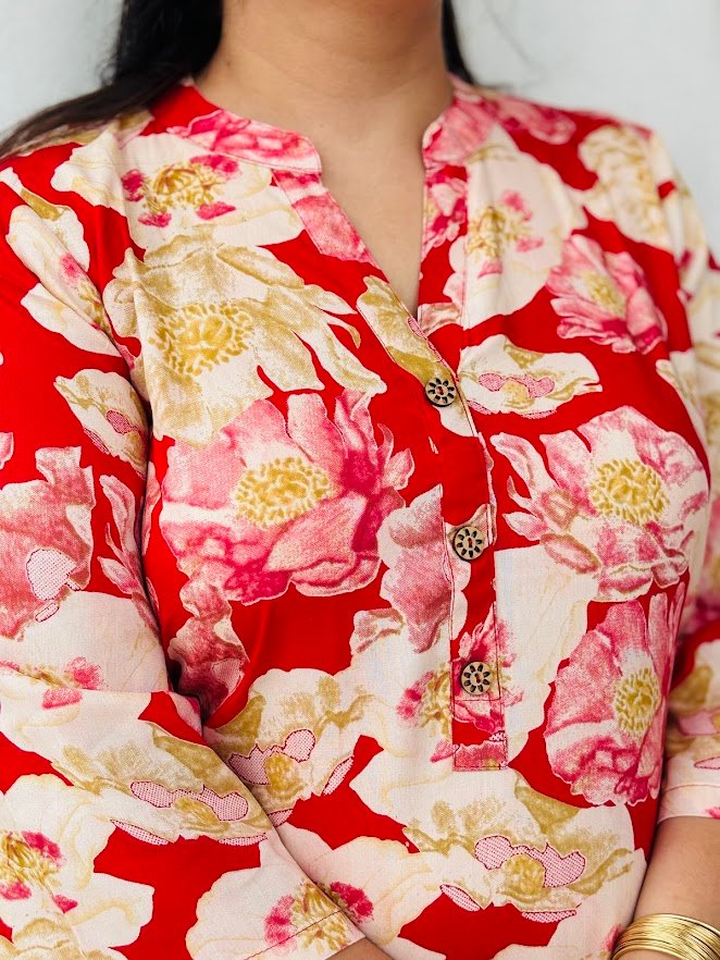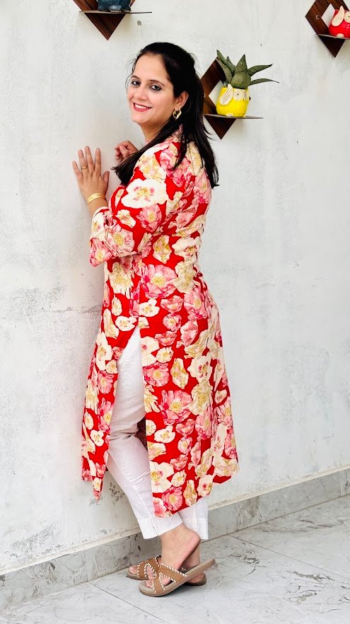 Add a touch of garden-fresh charm to your everyday look with this Red and Cream Floral Kurta. Designed for maximum comfort without sacrificing style, this straight-cut kurta is a must-have for your summer wardrobe.