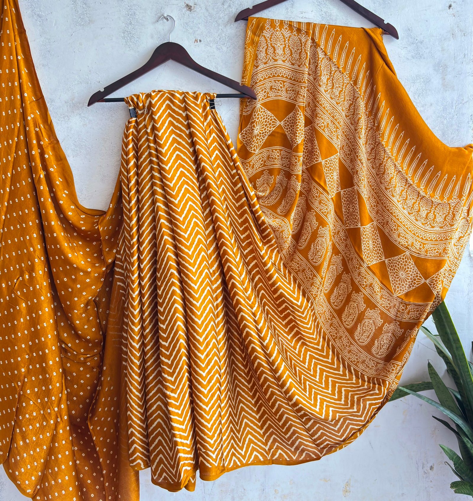 Elevate your ethnic wardrobe with this mustard and rust-toned saree. It features a unique three-pattern design: a bold zigzag (Leheriya-inspired) pattern on the pleats, a delicate bandhani-style polka dot drape, and an ornate mandala-printed pallu.