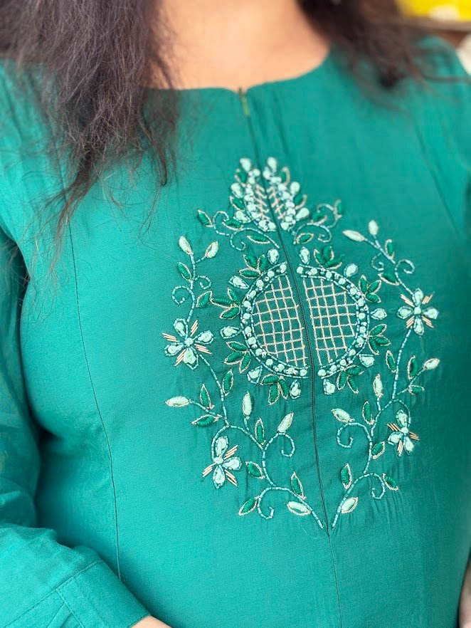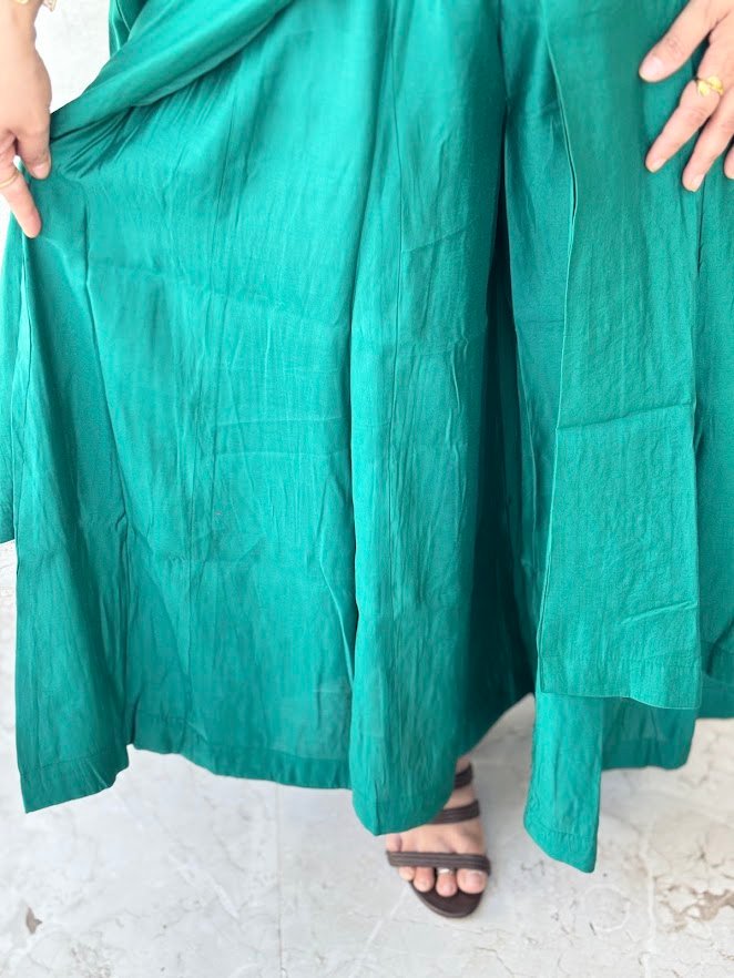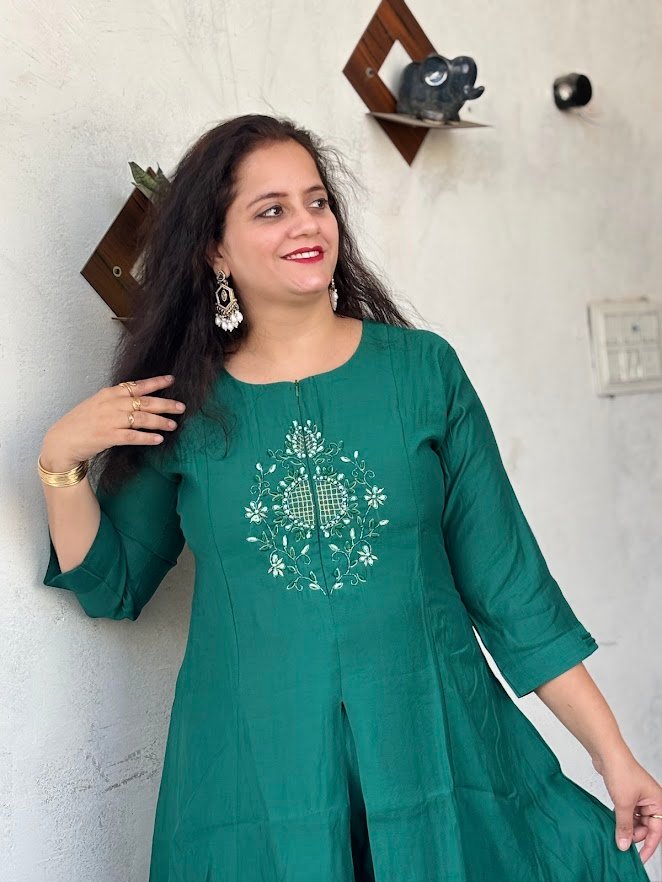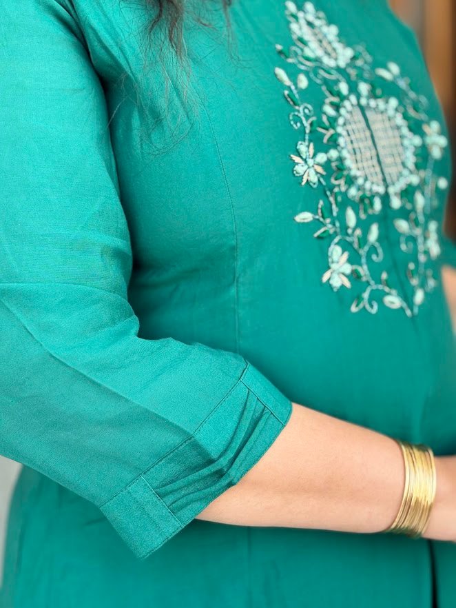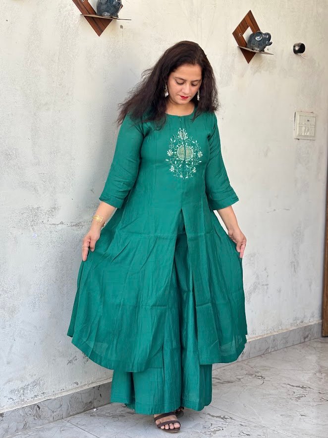 Step into the spotlight with this majestic Teal Green ethnic set. Featuring a unique front-slit flared kurta paired with wide-leg palazzo pants, this outfit offers a contemporary twist on the classic Anarkali. The chest is adorned with a delicate white and mint-green floral embroidery motif, adding a touch of understated luxury.