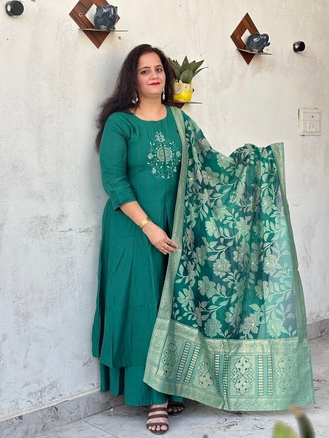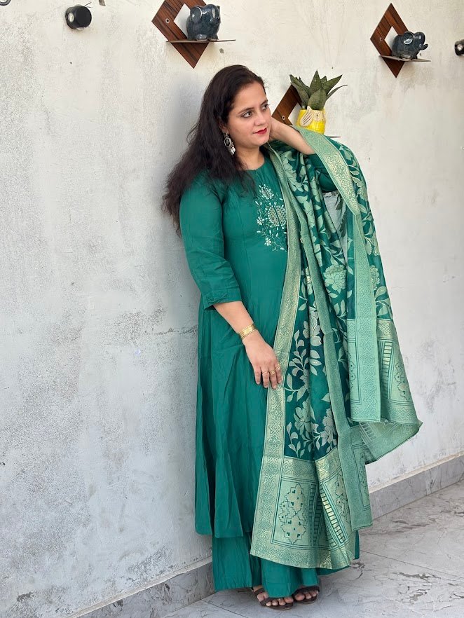 Teal Green Anarkali-Style Slit Kurta Set with Banarasi Silk Dupatta